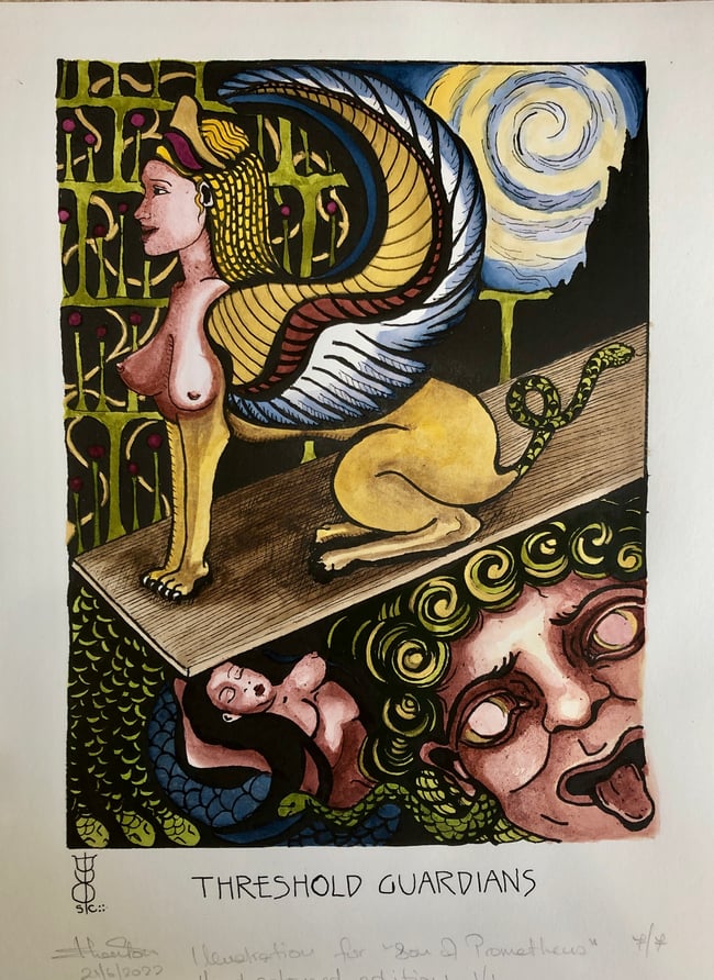 “Threshold Guardians” is an original illustration by Sasha Chaitow for her book Son of Prometheus: The Life and Work of Joséphin Péladan
